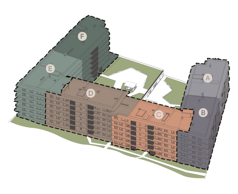 Dividido em seis blocos, atualmente encontram-se em comercialização os Blocos A e B, compreendendo apartamentos de tipologia T1 a T3 e espaços comerciais.