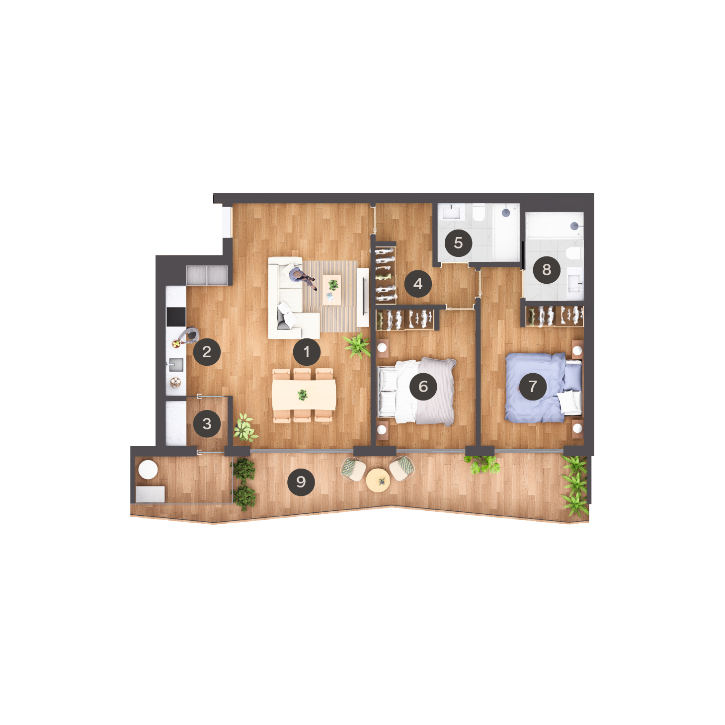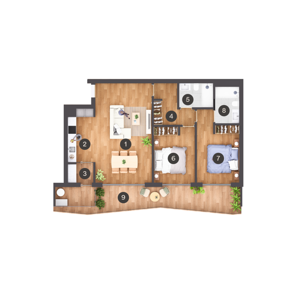 T2 | 1 Sala | 2 Cozinha | 3 T. Roupa | 4 Circulação | 5 IS | 6 Quarto | 7 Suite | 8 IS Suite | 9 Varanda e Estendal