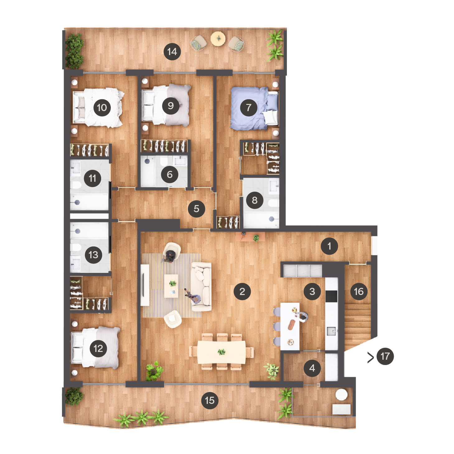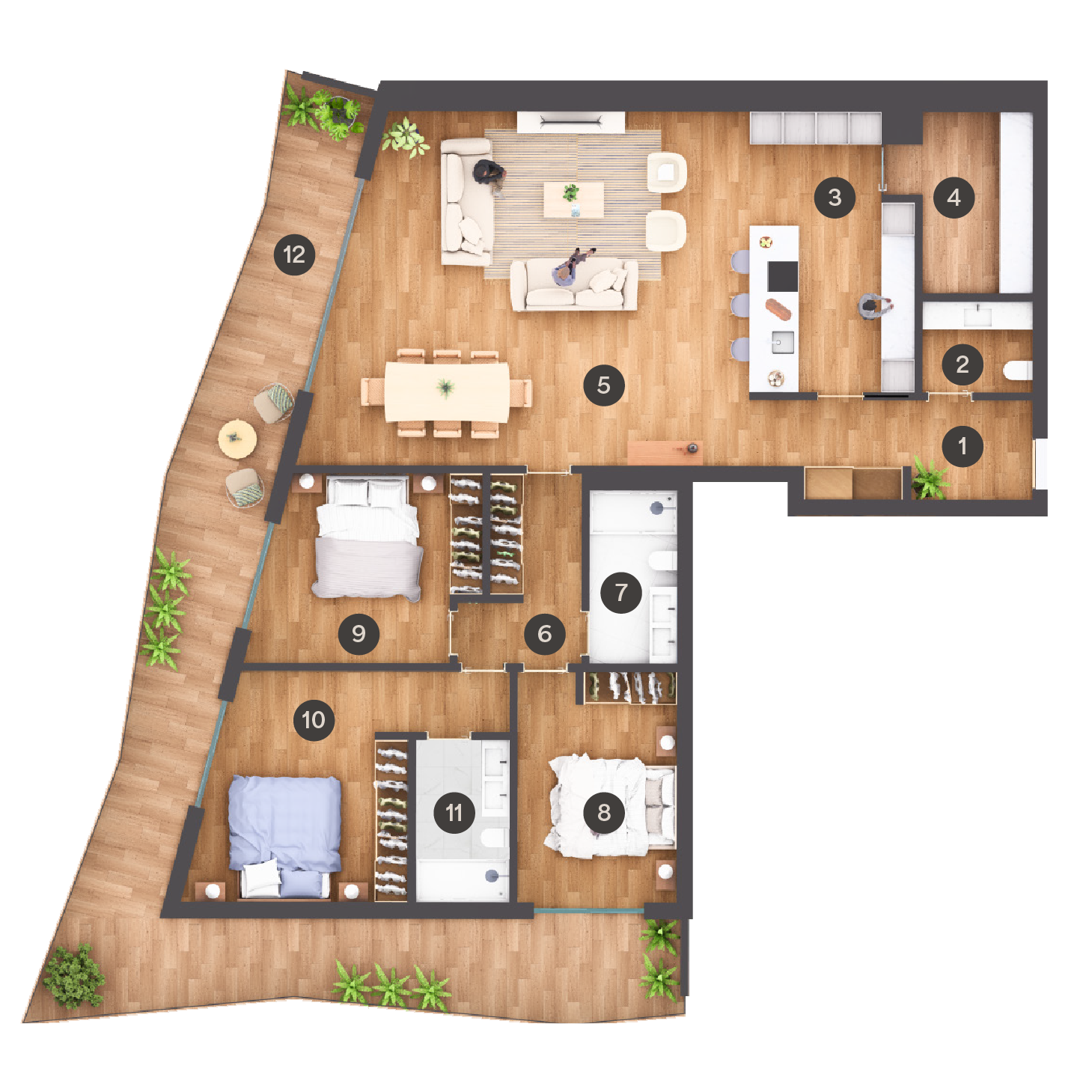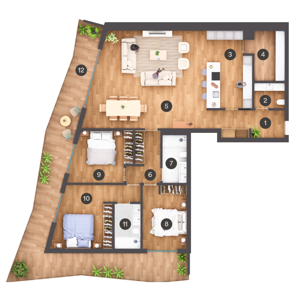 T3 | 1 Hall | 2 IS Social | 3 Cozinha | 4 T. Roupa | 5 Sala | 6 Circulação | 7 IS | 8 Quarto | 9 Quarto | 10 Suite | 11 IS Suite | 12 Varanda